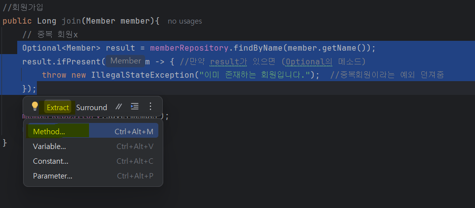 ➡️ 로직 입력시 길어져 메서드로 따로 빼고 싶으면 해당 부분 드래그해서 Extract Method 선택