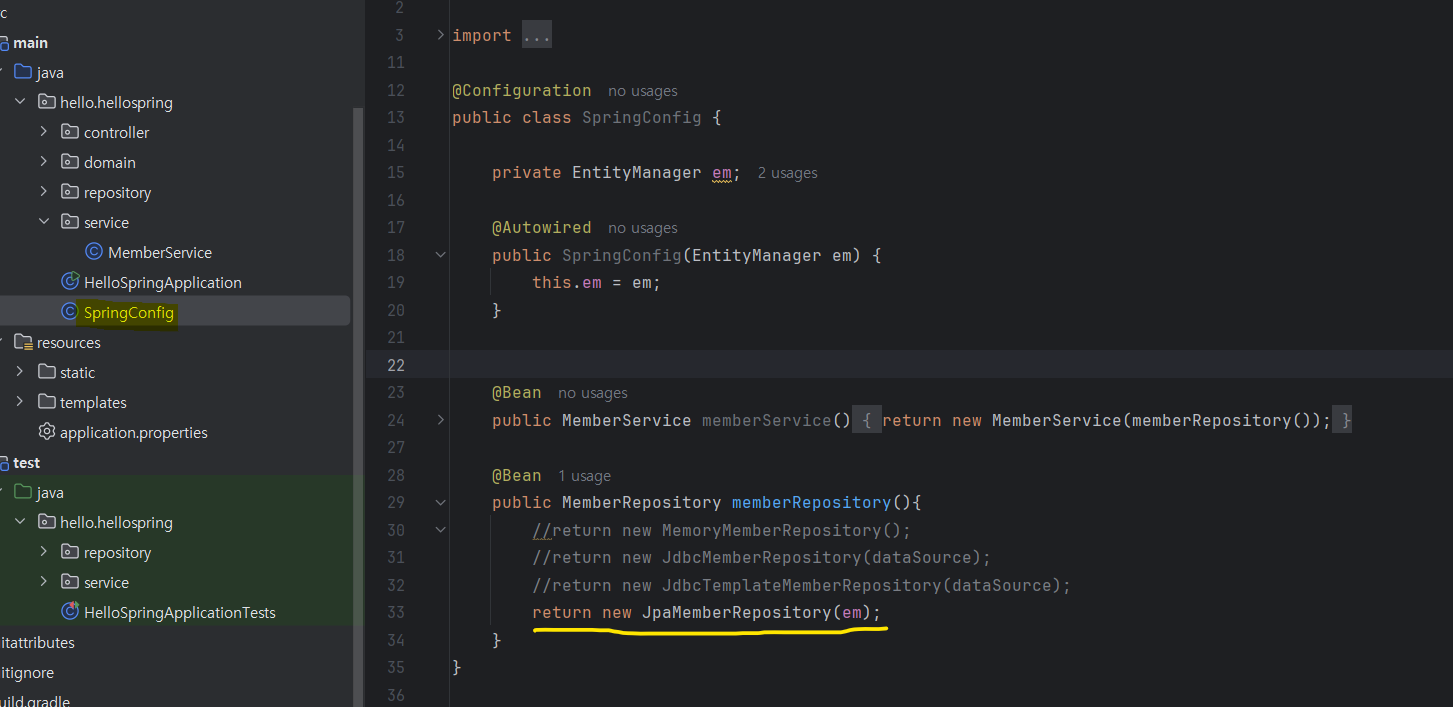 ➡️ SpringConfig를 JpaMemberRepository로 갈아끼워주고 EntityManager 맵핑해서 실행
