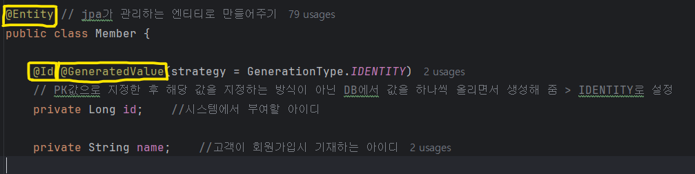 @Entity // jpa가 관리하는 엔티티로 만들어주기