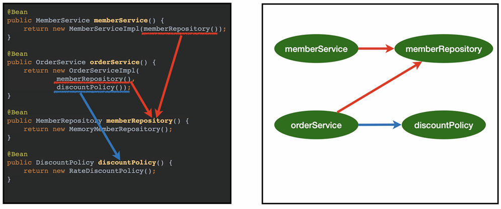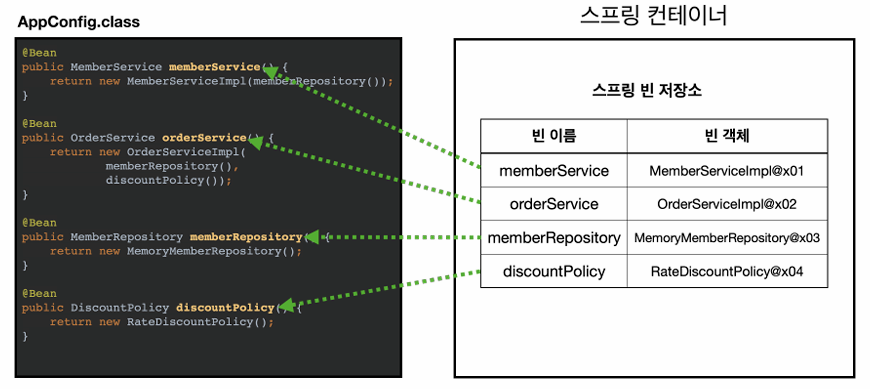 🔸스프링 빈 등록 : @Bean(name="")를 이용해 이름 직접 부여 가능 (항상 다른 이름 부여)