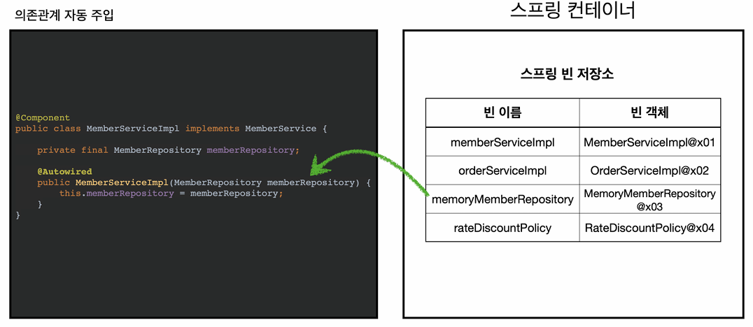 🔸생성자에 @Autowired 지정하면 스프링 컨테이너가 자동으로 주입 ( getBean(MemberRepository.class)와 비슷)